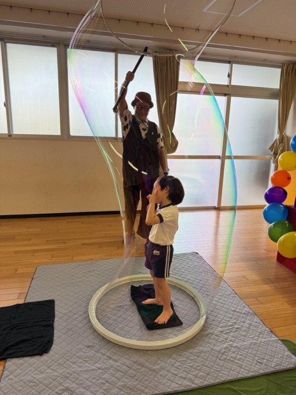 ショーの最後には、人が入れるシャボン玉に一人ずつ入らせてもらいました。その不思議空間に入った子どもたちの表情!!嬉しい・どきどき、ちょっと怖い・触ってみたい様々な感情が出ていて見ている方も楽しかったです!