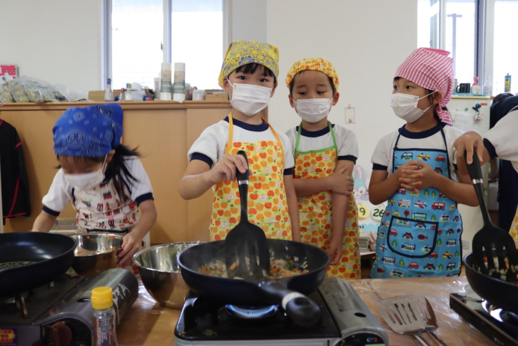 ゲームの後は、いよいよ夕食作りです。メニューは「キムチ焼き飯」です。みんなで協力して作った夕食は、格別のおいしさでした♪
