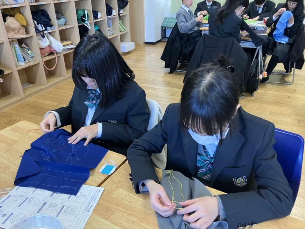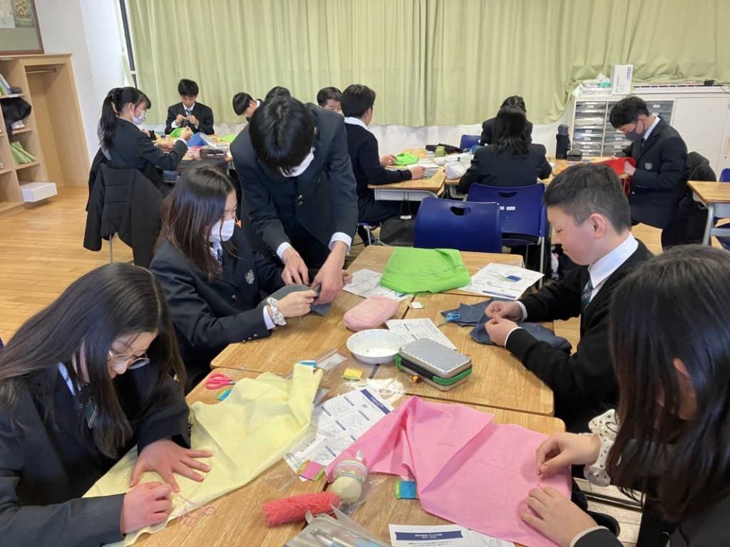 中学1年生、家庭科授業で裁縫をしているところです。