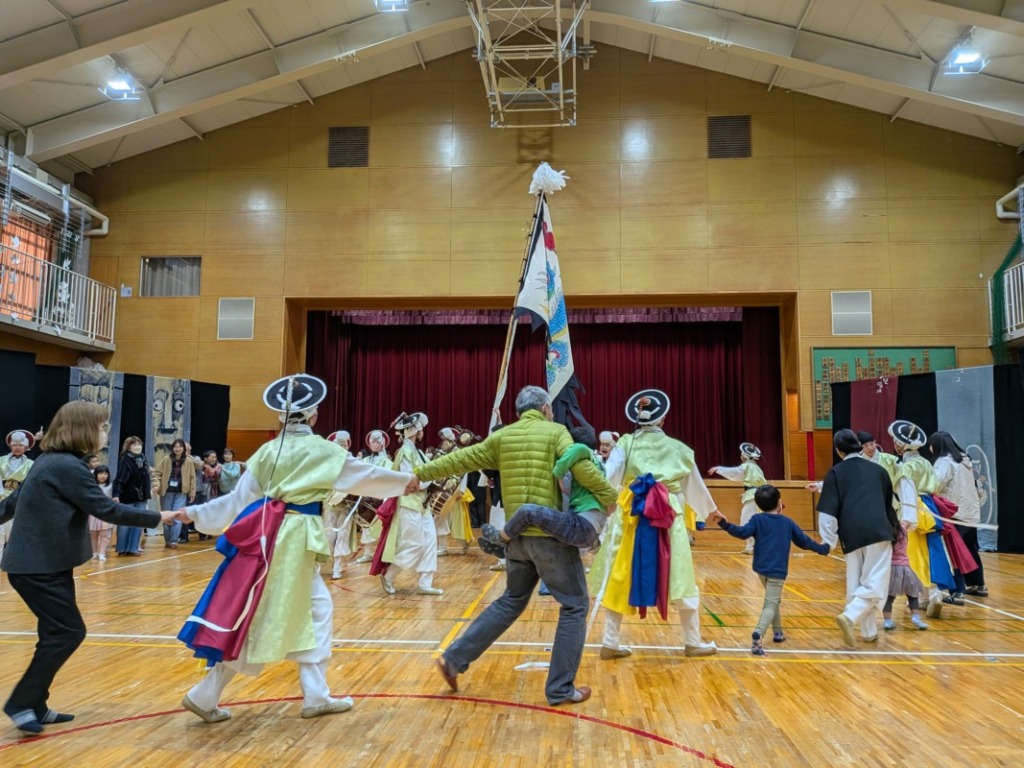 12月13日(土)、箕面市立萱野小学校体育館にて伝統芸術部が公演を行いました。「みのお市民人権フォーラム」の特別イベントとして実施されました。地域の方々を中心に多くの方が詰めかけ、おおいに盛り上がりました。最後にはアリランの曲に合わせて観客も一緒になって踊りました。